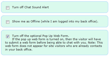 ● Below the Online / Offline Message are settings that can be customized as per your requirements. ● Turn off Chat Alert Sound: Checking this checkbox will turn off the chat alert sound. Un-checking will turn on to the chat sound. ● Turn off Chat Optional pop out Form: Checking this checkbox will turn off the optional pop out form that the visitor is required to submit before the chat session is initiated with you. If the checkbox is unchecked the Visitor will have to submit the form to be able to chat with you. The optional pop out form can also serve to gather visitor information and follow up if required. ● Show Me as Offline: Checking this checkbox will show you as offline even if you are logged into your back office. |