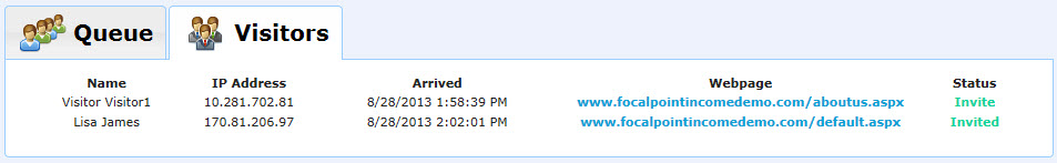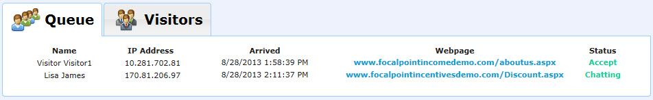 ● Queue Tab: This tab will have a list of Visitors who are chatting with you. A Member can initiate chat from the Visitors tab or the Visitor can initiate chat on the Member’s web site by clicking on the Chat Icon. The Status on the Queue tab would have two listings – Chatting and Accept.