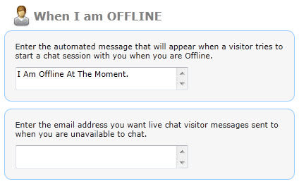 ● On the right hand side of the screen are the OFFLINE message settings where you can update the text that the Visitor will see when you are offline (as shown in the figure below). ● Settings OFFLINE Message: Enter the Offline message that you would like your visitor to see when you are not logged into the System or Live Chat. ● Email Address Where Offline emails are to: Enter the email that you want to receive queries on from site visitors when you are offline. |