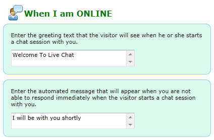 ● On the left hand side of your screen is the When I Am Online message settings. Enter the text that would like to display on the Chat Window when you start the chat session with your visitor (as shown in the figure below). ● ONLINE Welcome Text: Enter the text message you would like the Visitor to see when the Messenger Screen opens up for the first time. ● ONLINE Please Wait For Operator text: Enter the text message you would like the visitor to receive if your response is delayed by more than 1 minute. |