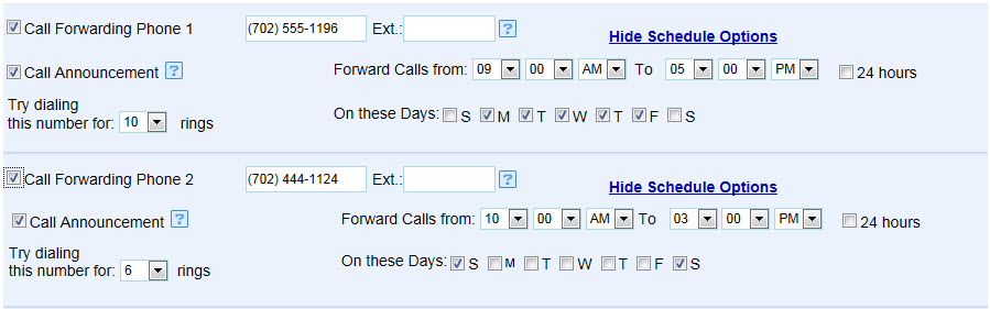 ● Call Forwarding Schedule: Select the Start Time with an AM or PM setting. This is the time of day call forwarding will begin. Select the End Time with an AM or PM setting. This is the time of day call forwarding will end. Check the checkboxes for the days of the week that you want call forwarding on for. Uncheck the days you don't want calls forwarded to you on.